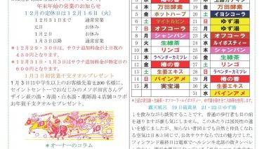 未分類10月12日(日)はラベンダー湯 10月12日(日)はラベンダー湯。中学生以上先着2,000名様に記念タオルプレゼント。小学生以下の方には先着200名様にヤクルトプレゼント。 2025.09.26未分類