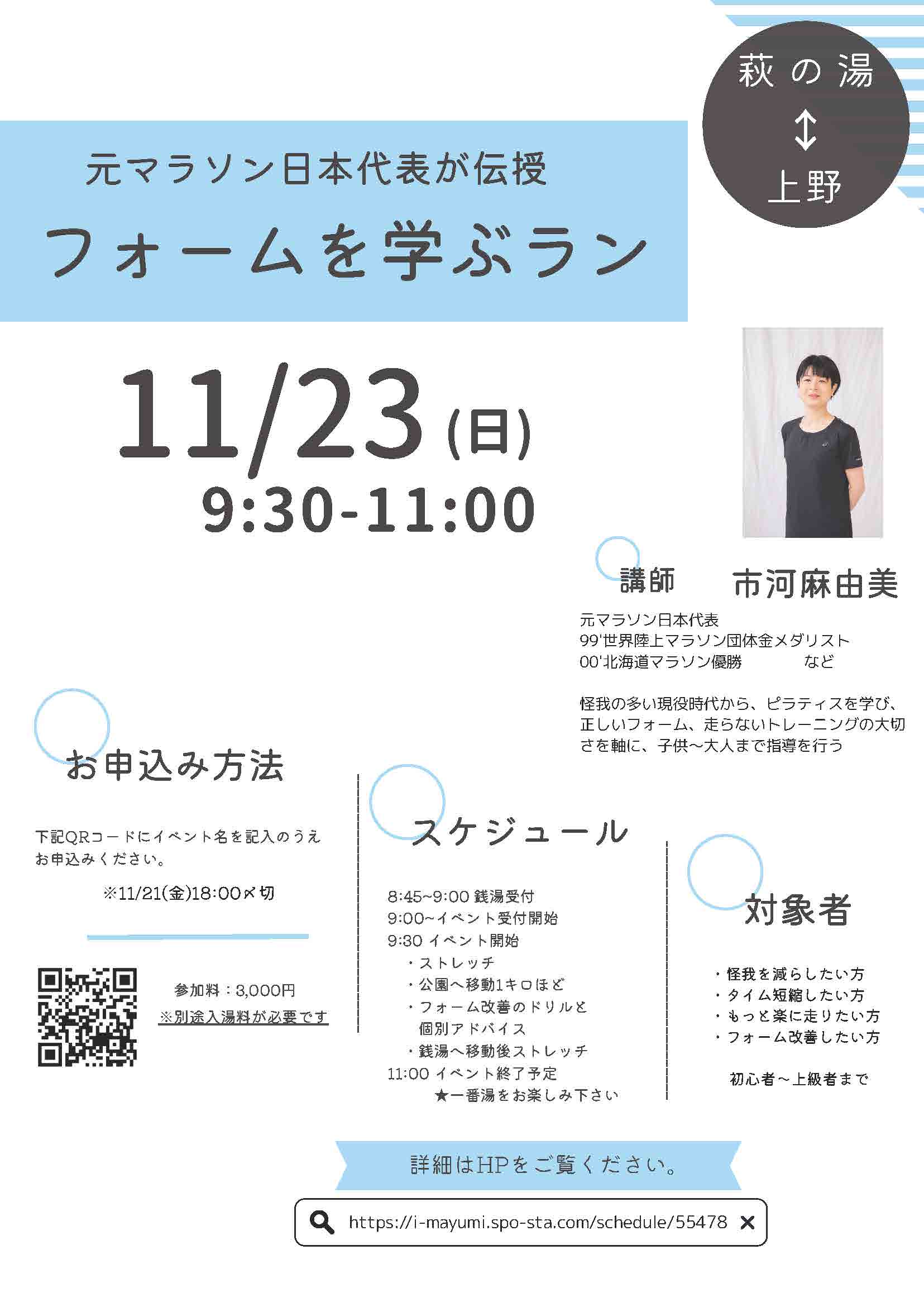 11月23日(日)は萩の湯にて元マラソン日本代表市河麻由美さんによる「ランニングレッスン」を実施します。料金は3,000円、申し込みは以下よりお願いします。