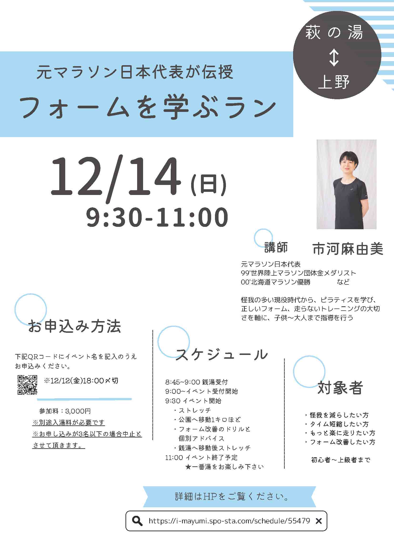 12月14日(日)は萩の湯にて元マラソン日本代表市河麻由美さんによる「ランニングレッスン」を実施します。料金は3,000円、申し込みは以下よりお願いします。