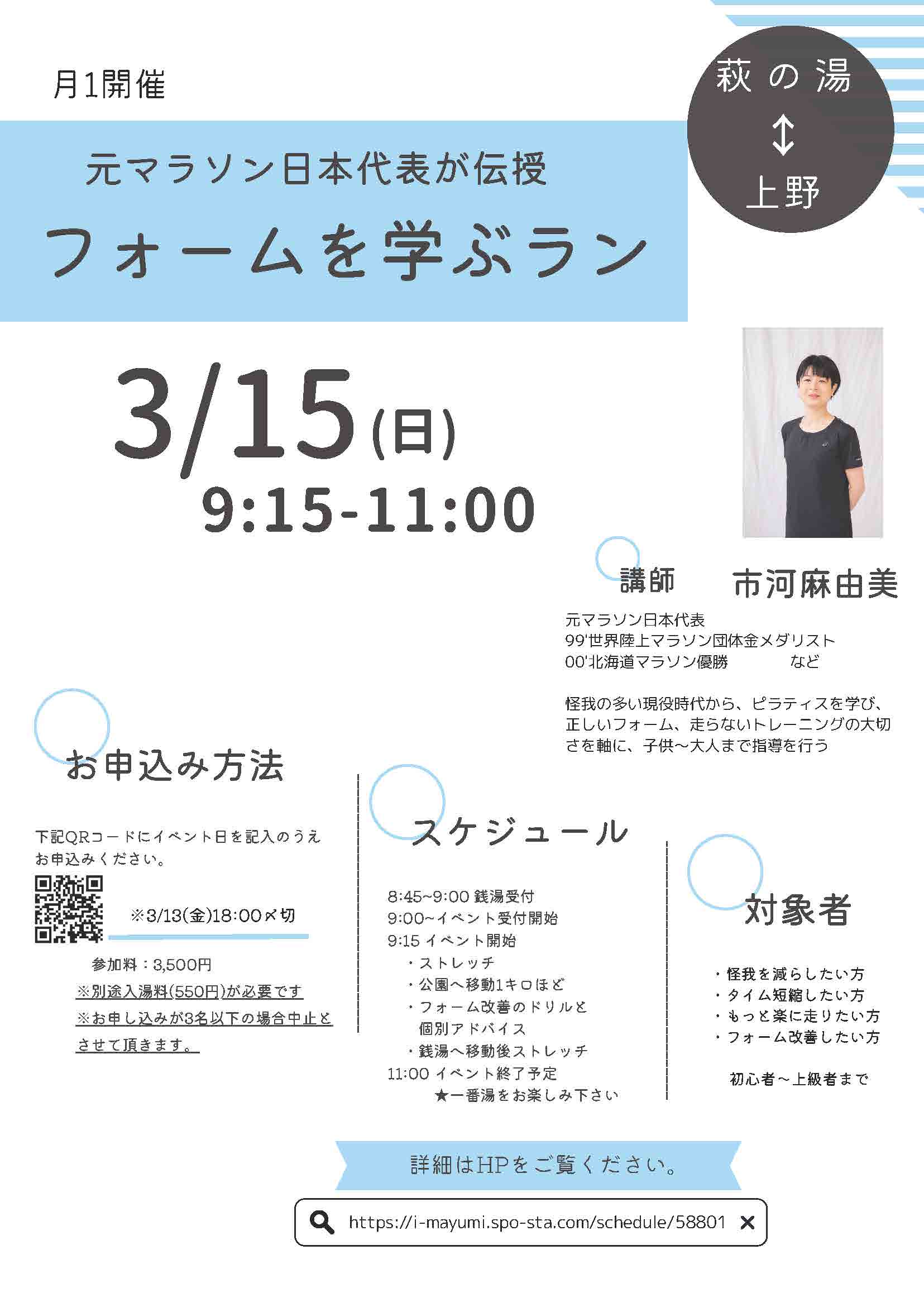 3月15日(日)は萩の湯にて元マラソン日本代表市河麻由美さんによる「ランニングレッスン」を実施します。料金は3,500円+入浴料550円、申し込みは以下よりお願いします。