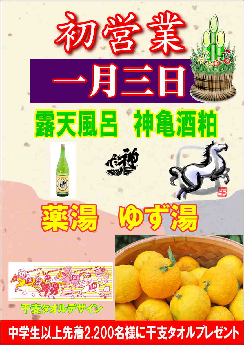 新年初営業1月3日は柚子湯&神亀酒粕です。中学生以上先着2,200名様に萩の湯・寿湯・白水湯・薬師湯コラボ干支タオル配布いたします。