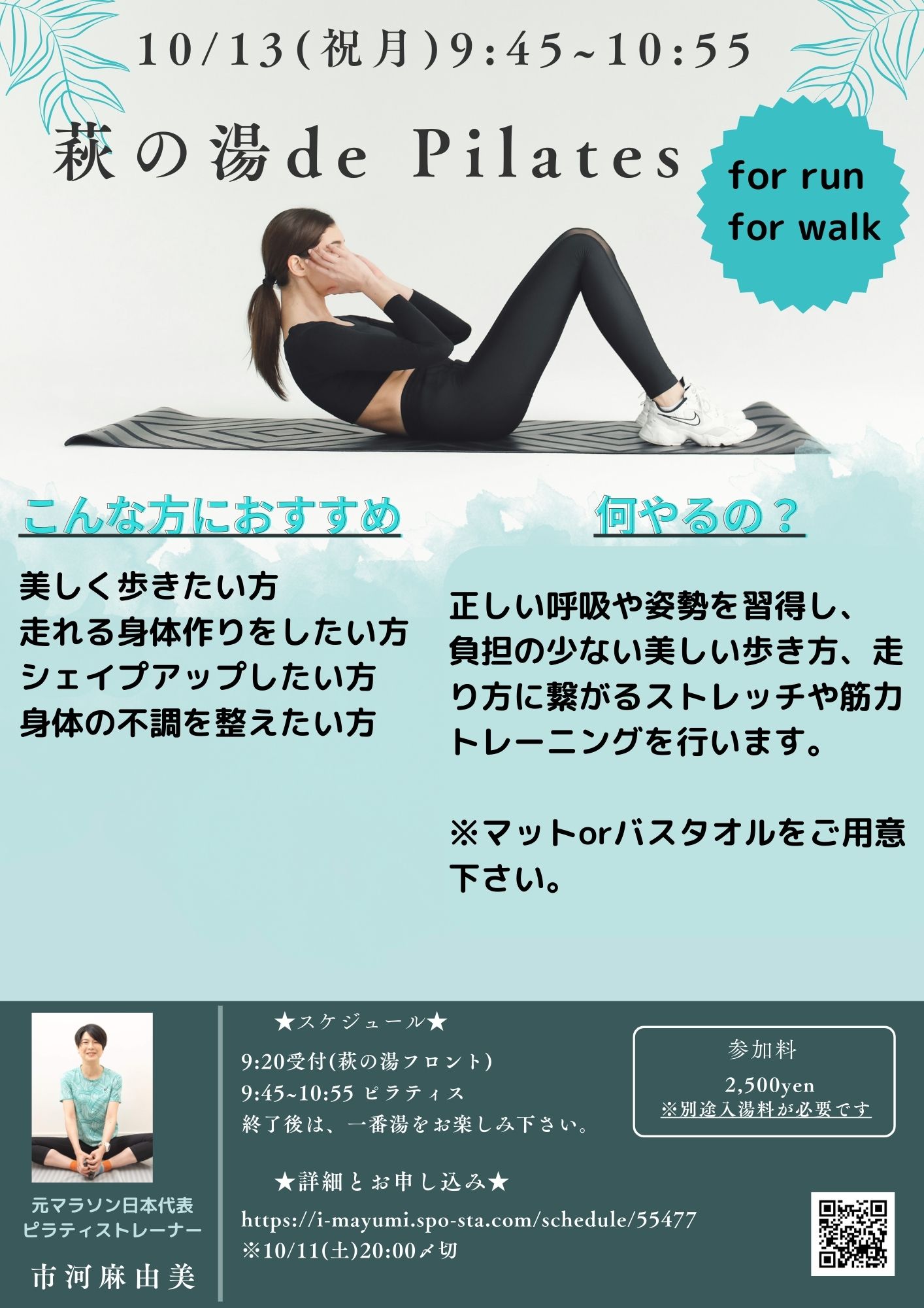 10月13日(月祝)は萩の湯2階を利用して元マラソン日本代表市河麻由美さんによる「ピラティス」を実施します。料金は2,500円、申し込みはより以下お願いします
