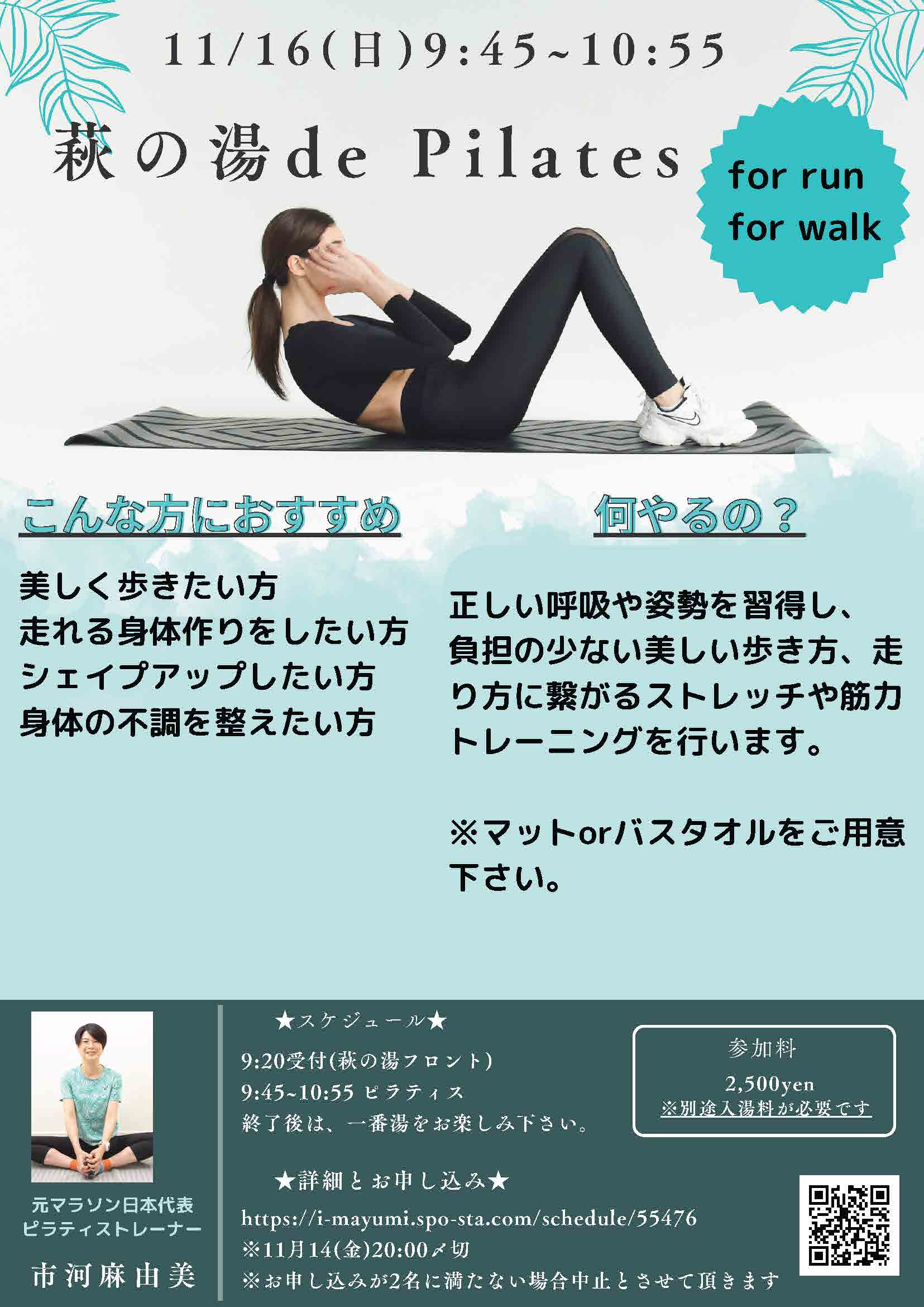 11月16日(日)は萩の湯2階を利用して元マラソン日本代表市河麻由美さんによる「ピラティス」を実施します。料金は2,500円、申し込みはより以下お願いします。