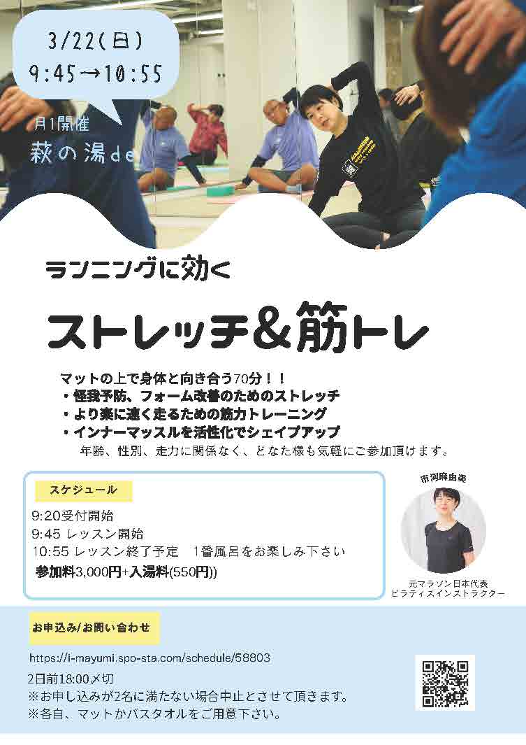 3月22日(日)は萩の湯2階を利用して元マラソン日本代表市河麻由美さんによる「ランニングに効くストレッチ&筋トレ講座」を実施します。料金は3,000円+入浴料550円、申し込みは以下よりお願いします。