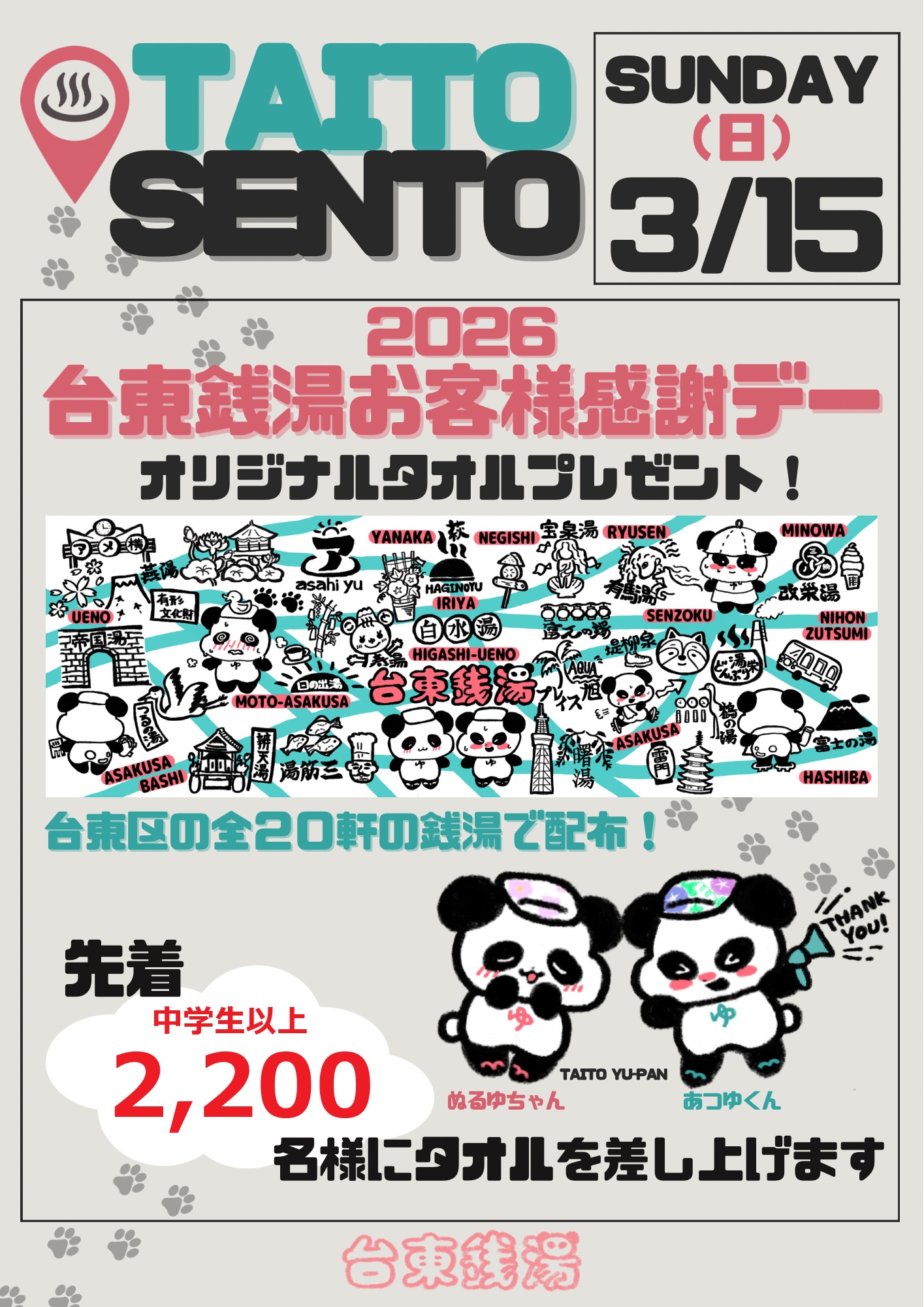 3月15日(日)は台東区お客様感謝デー 未分類 2026.02.273月15日(日)は台東区お客様感謝デー。萩の湯では中学生以上先着2,200名様に記念タオルプレゼント。お茶の葉湯でお待ちしております。