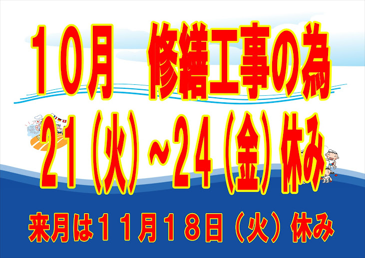 10月21日(火)~24日(金)修繕工事のためお休みします。